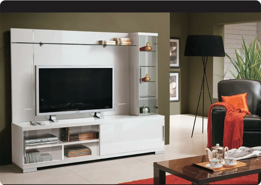 FINISHED IN A WHITE HIGH GLOSS LACQUER. FEATURES GLASS SHELVES AND TWO SLIDING DOORS ON THE BASE WITH PLENTY OF ROOM FOR ALL YOUR AUDIO AND VIDEO EQUIPMENT.
