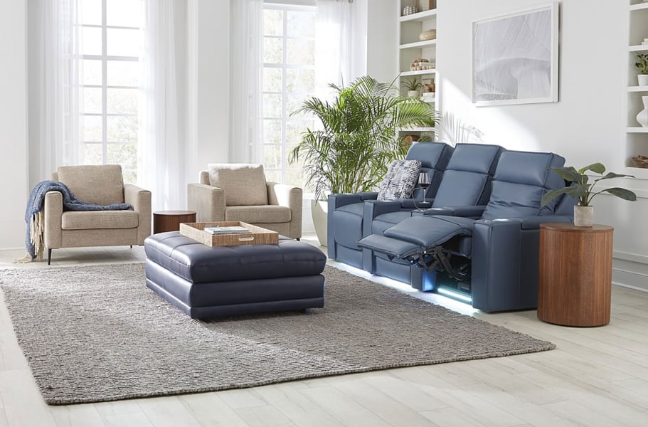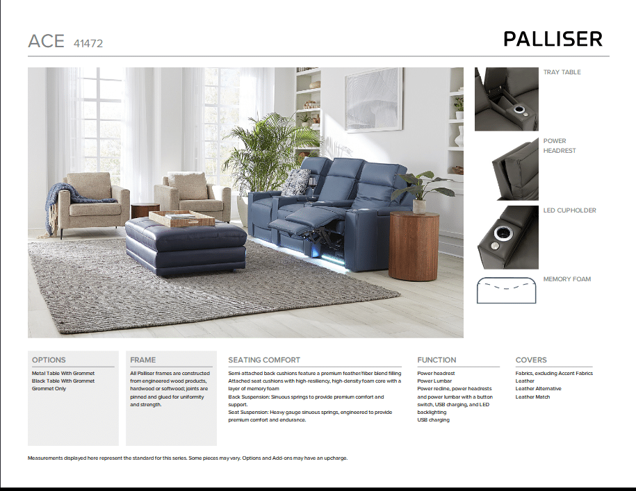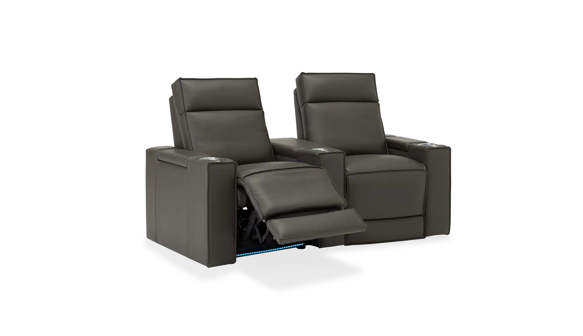 Power recline, power headrests and power lumbar with a button switch featuring integrated USB charging, and LED backlighting, finished in an attractive brushed metal.