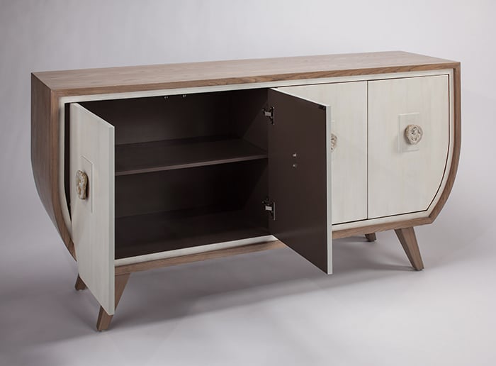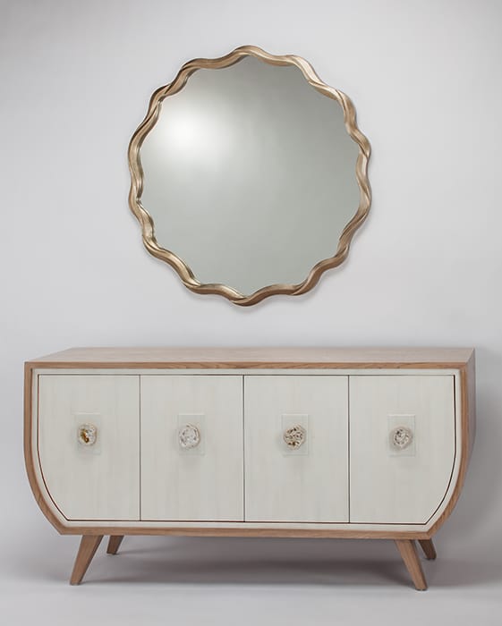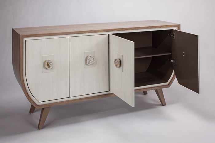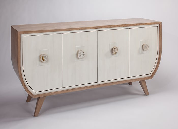 • Finish: Case in faux natural oak. Door front with very subtle eggshell finish with soft oak wash. Geo knobs