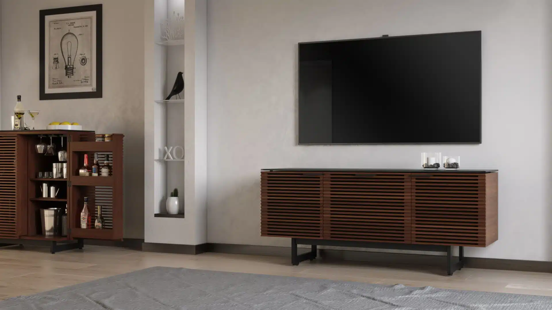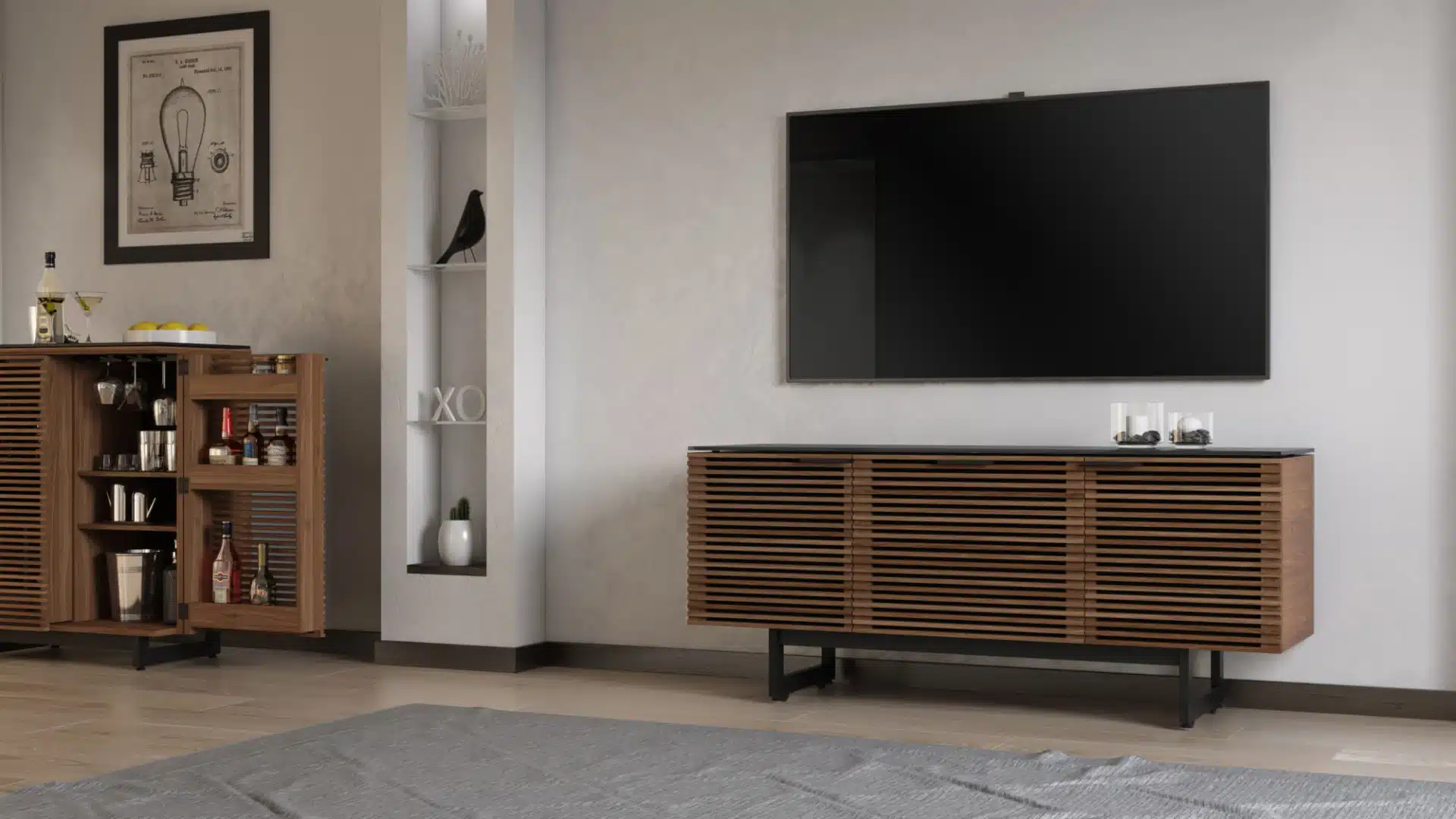 CORRIDOR 8177 is three compartments wide. The center drawer pulls out to reveal a full-width soundbar speaker shelf and a media storage drawer.