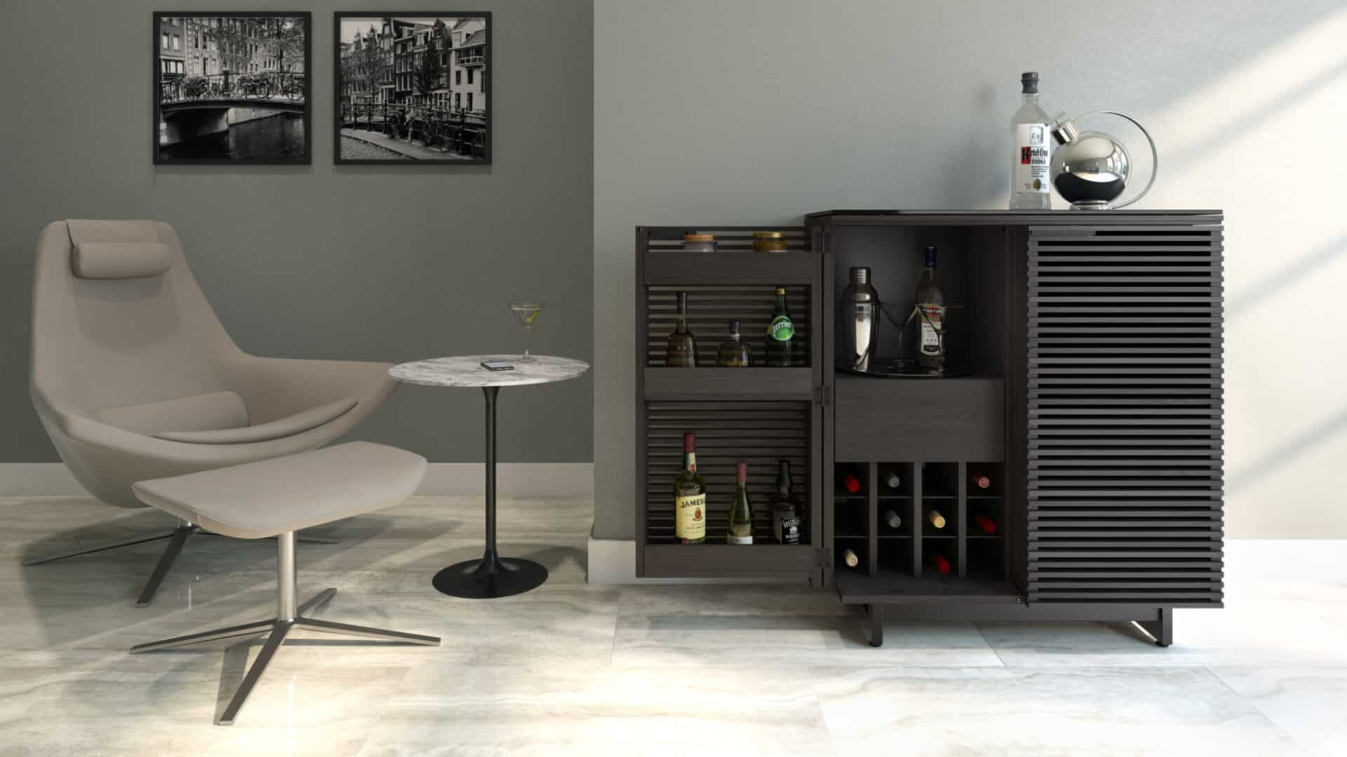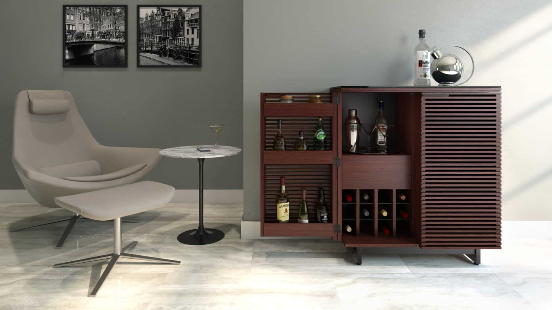 The Corridor Bar is the perfect cocktail of style and function. Double louvered doors open fully, revealing ample bottle and glassware storage and providing easy access to everything a stocked bar cabinet needs.