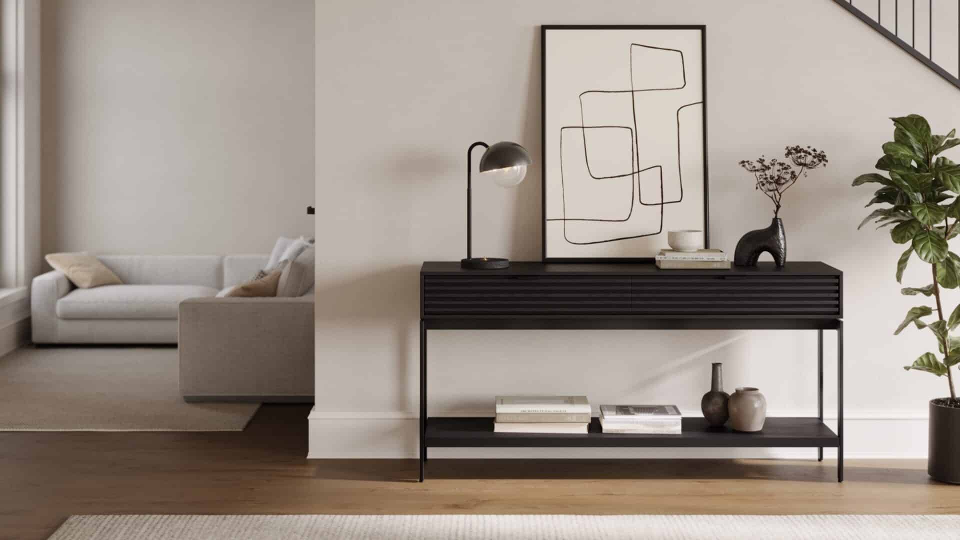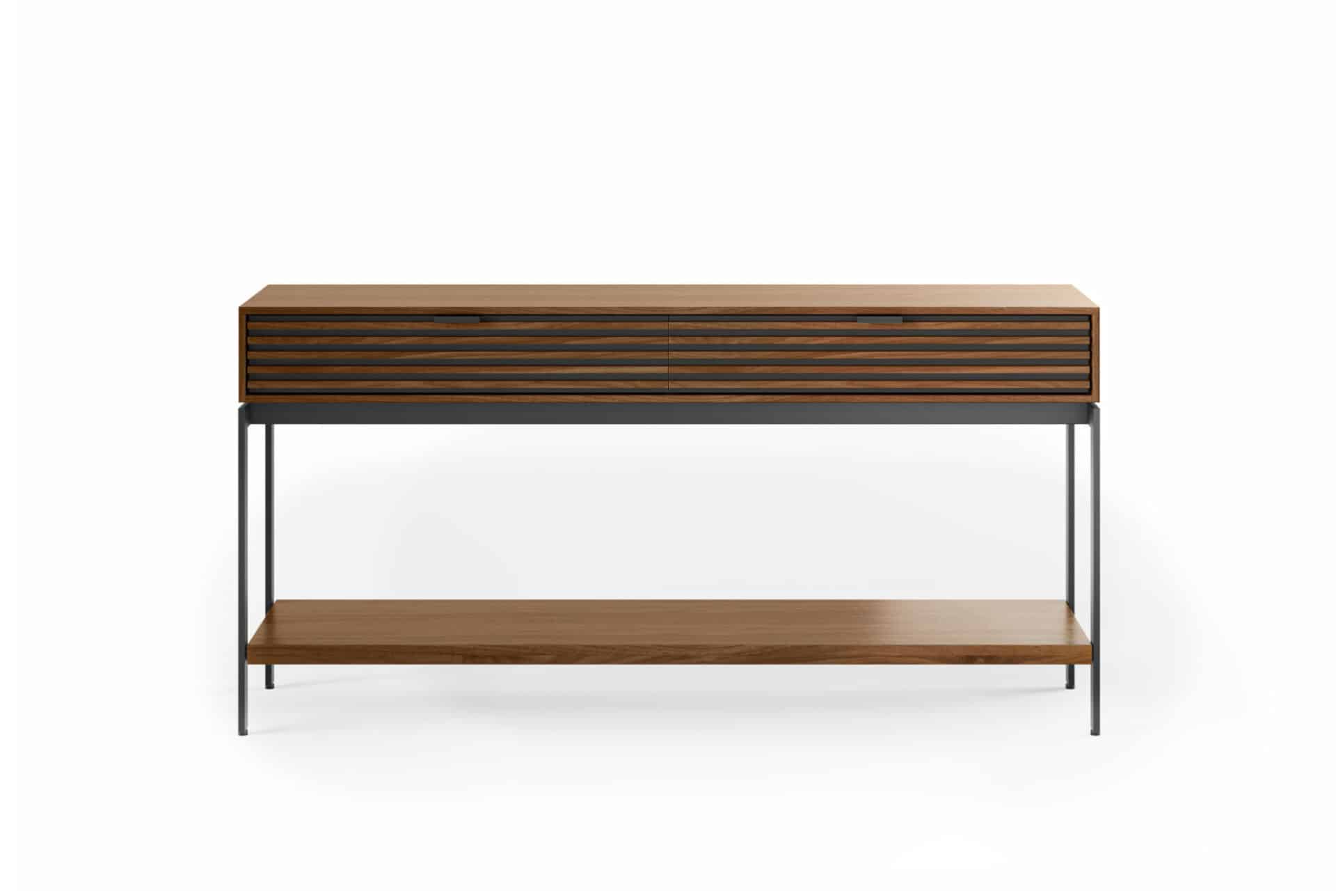 Cora Console (1)At home in an entryway or under a TV, The Cora console is a sleek design with intelligent function. It features a louvered front, lined storage drawers, and ample space to display personal items.
