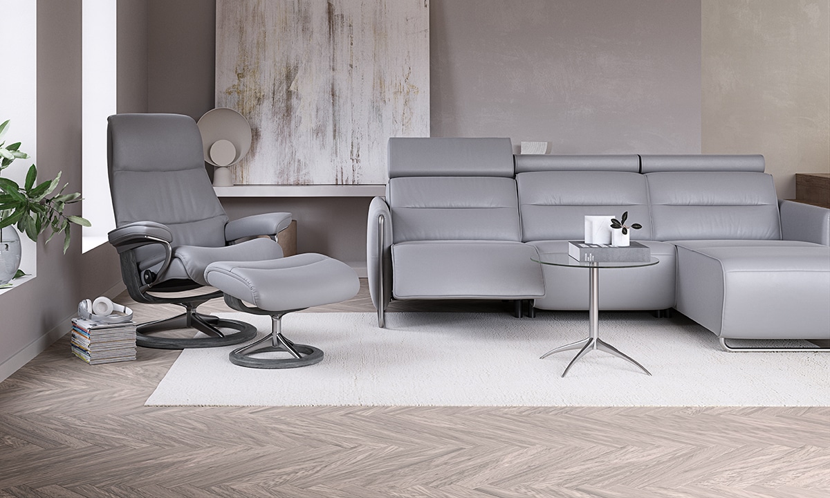 Sleek lines with a modern look give Stressless Emily an embracing appearance. The contemporary design of the soft enveloping cushions invites you to sit down and relax. All seat modules come with an adjustable headrest. Either with fixed seat-back or fitted with motors for personal adjustment of back and leg support. Choose between either steel or wood details on the armrest. The recliners Stressless Tokyo and Stressless View both couple up nicely with the Stressless Emily sofa.