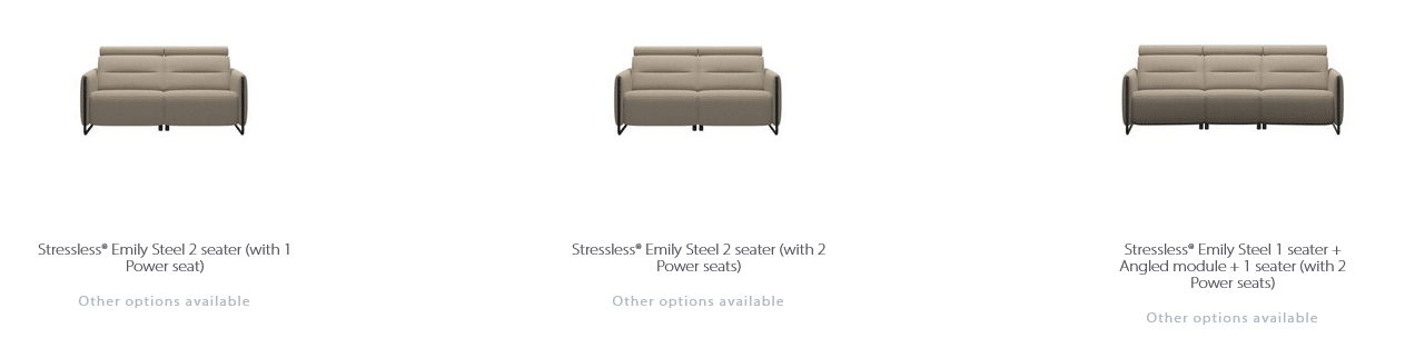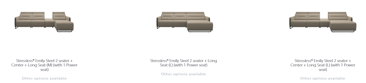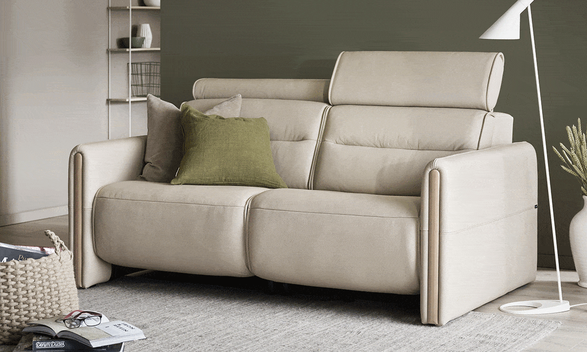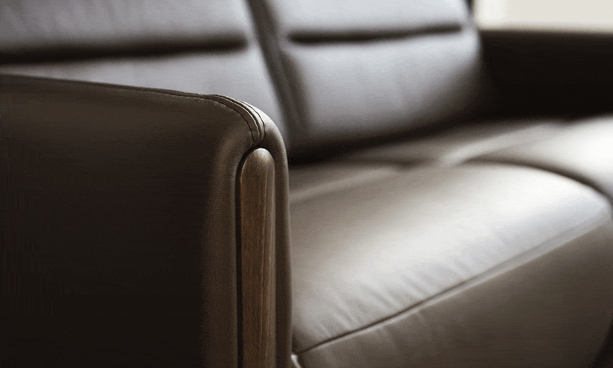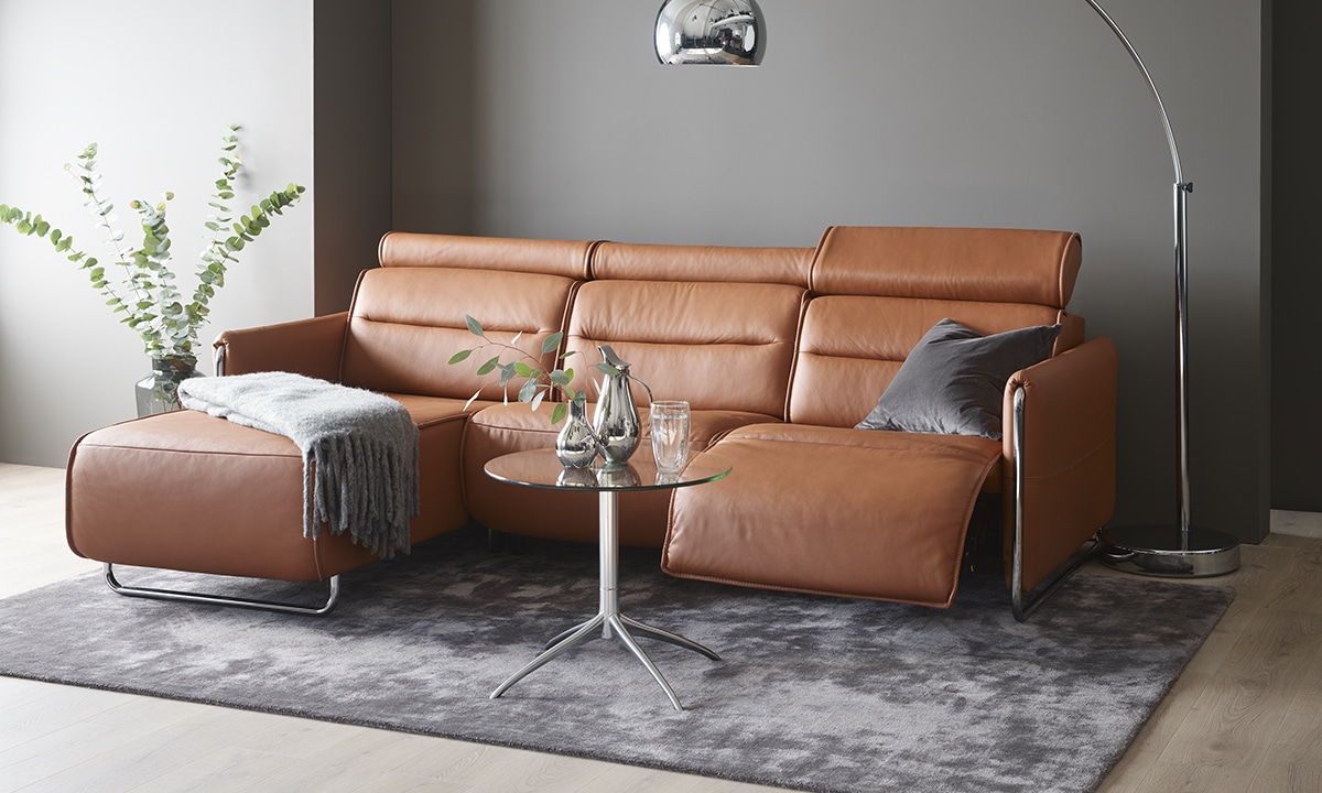 Sleek lines with a modern look give Stressless Emily an embracing appearance. The contemporary design of the soft enveloping cushions invites you to sit down and relax. All seat modules come with an adjustable headrest. Either with fixed seat-back or fitted with motors for personal adjustment of back and leg support. Choose between either steel or wood details on the armrest. The recliners Stressless Tokyo and Stressless View both couple up nicely with the Stressless Emily sofa.