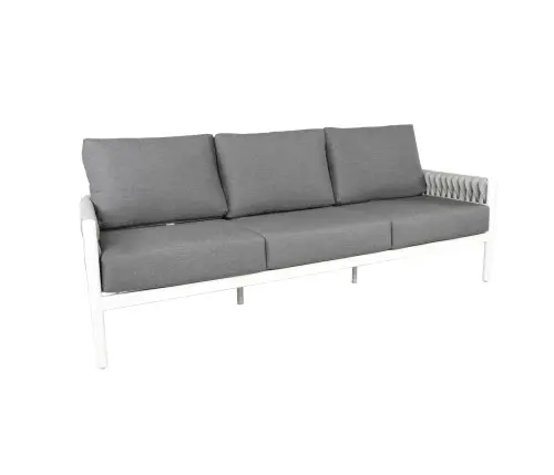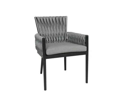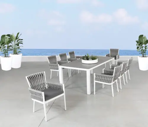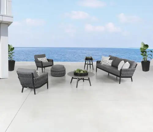 Named after the woven design elements of an outdoor garden trellis and resembling the comfort of your favorite cozy knit blanket, the Trellis collection is not only visually captivating; it is as plush and luxurious as it looks. Trellis is highlighted with Shadow SOL Rope™ woven onto a Sherwin-Williams® Black aluminum frame or Zinc SOL Rope™ on a Tiger Drylac® White aluminum frame. Discover this collection in deep seating, sectional, and dining options to suit any outdoor entertainment needs. Group photo shows cushions in 40483-0001 Cast Charcoal, 21″ x 13″ pillows in 145337-0001 Zebra Smoke, and 18″ x 18″ pillows in 5402 Canvas Granite.